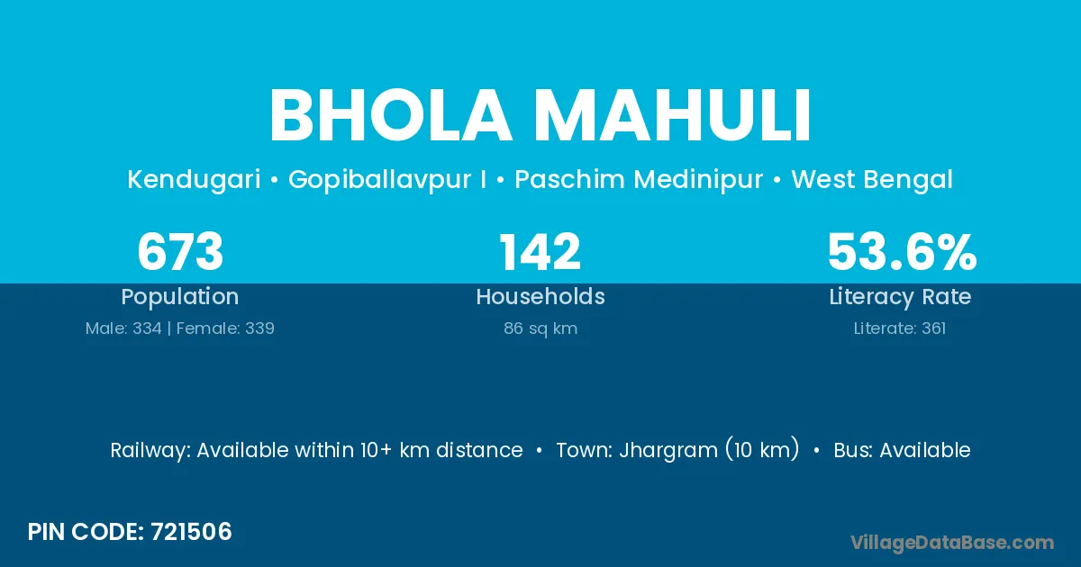 Jhargram (10 km) is the nearest town to Bhola Mahuli village for major economic activities and is located approximately 10 km away.