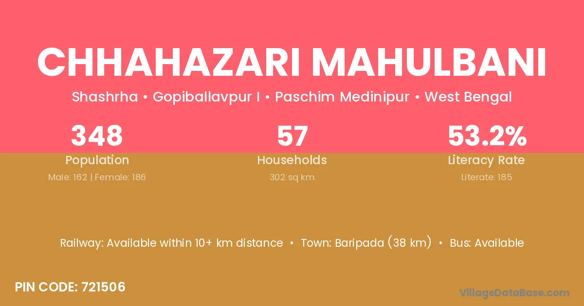 Baripada (38 km) is the nearest town to Chhahazari Mahulbani village for major economic activities and is located approximately 38 km away.