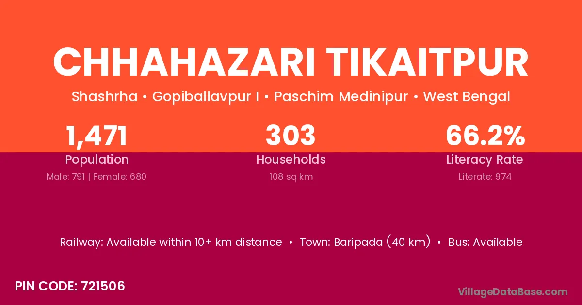 Baripada (40 km) is the nearest town to Chhahazari Tikaitpur village for major economic activities and is located approximately 40 km away.