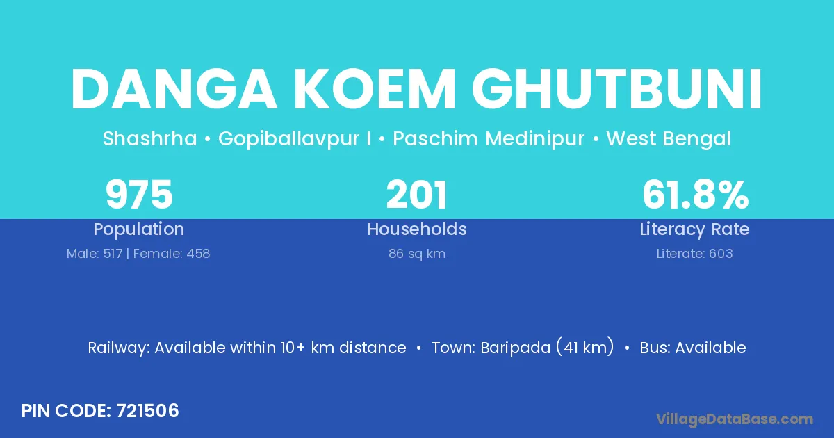 Baripada (41 km) is the nearest town to Danga Koem Ghutbuni village for major economic activities and is located approximately 41 km away.