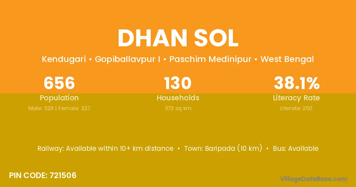 Baripada (10 km) is the nearest town to Dhan Sol village for major economic activities and is located approximately 10 km away.
