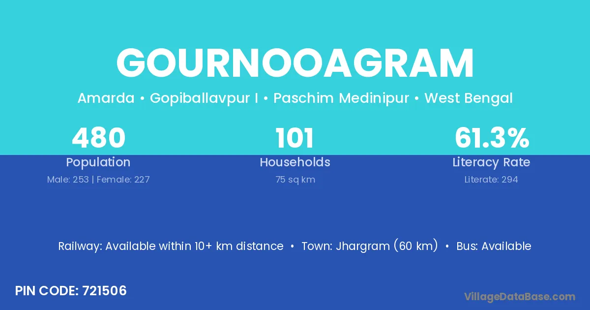 Jhargram (60 km) is the nearest town to Gournooagram village for major economic activities and is located approximately 60 km away.