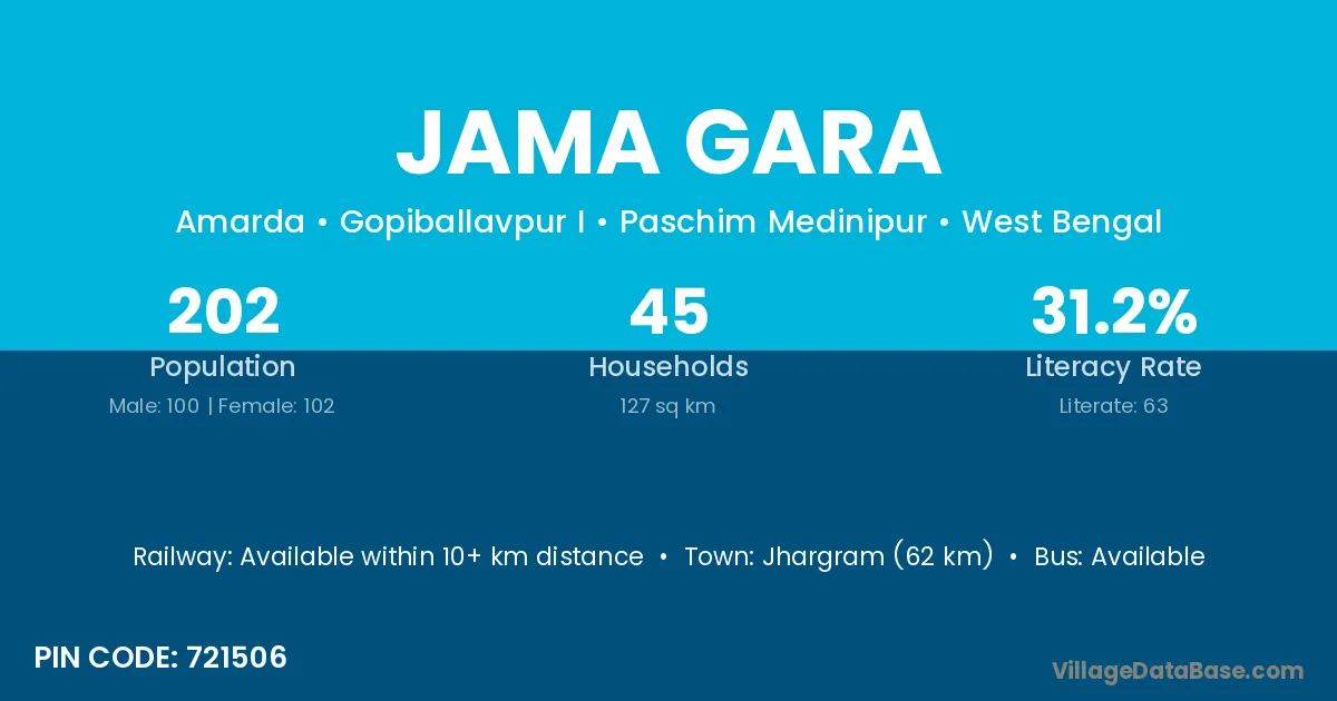 Jhargram (62 km) is the nearest town to Jama Gara village for major economic activities and is located approximately 62 km away.