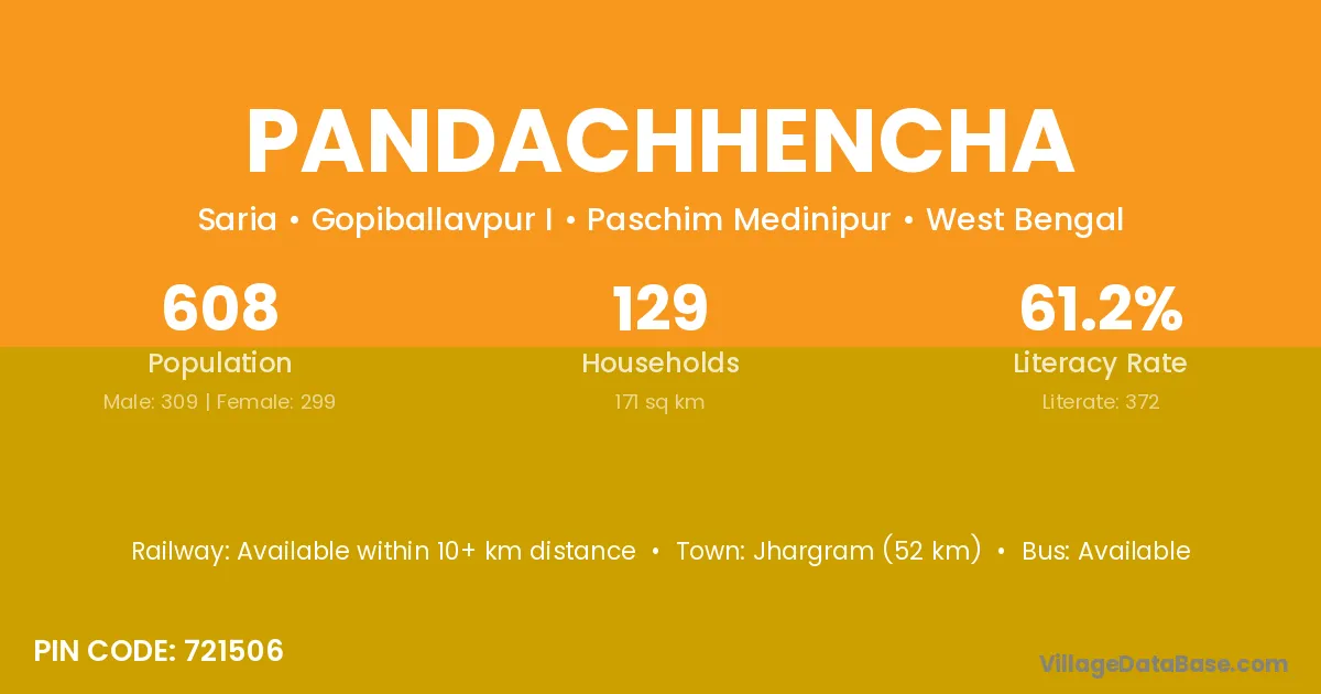 Jhargram (52 km) is the nearest town to Pandachhencha village for major economic activities and is located approximately 52 km away.
