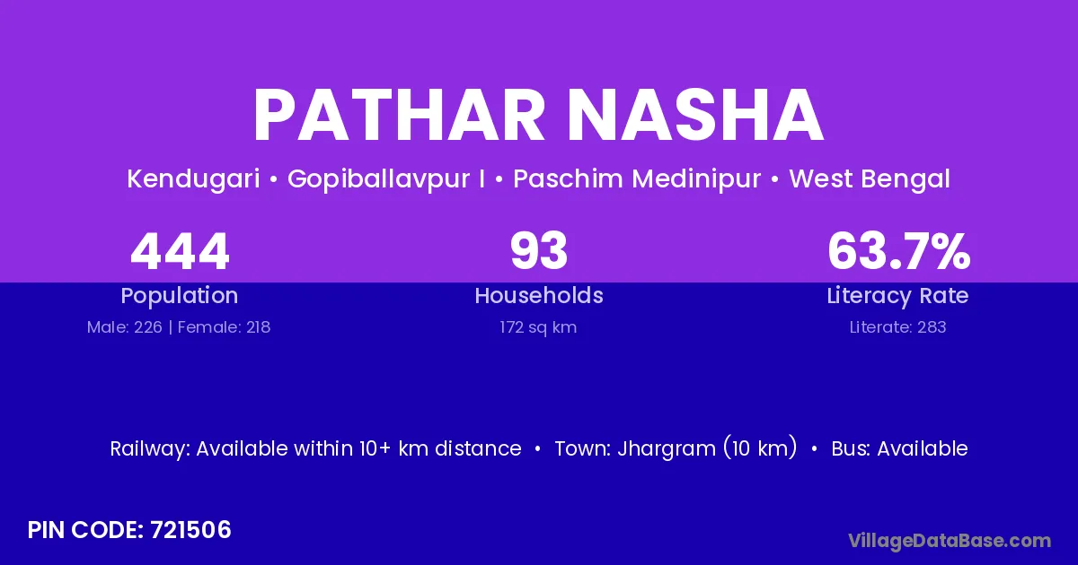 Jhargram (10 km) is the nearest town to Pathar Nasha village for major economic activities and is located approximately 10 km away.