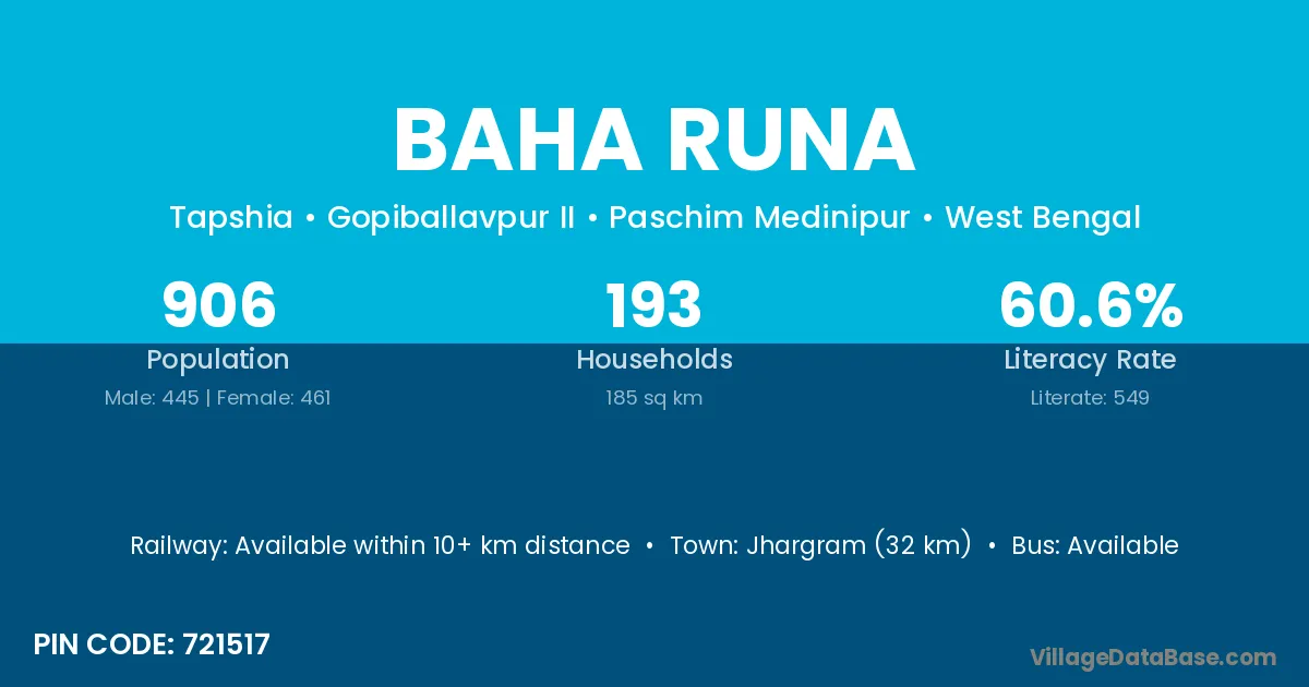 Jhargram (32 km) is the nearest town to Baha Runa village for major economic activities and is located approximately 32 km away.
