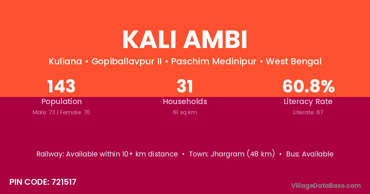 Jhargram (48 km) is the nearest town to Kali Ambi village for major economic activities and is located approximately 48 km away.