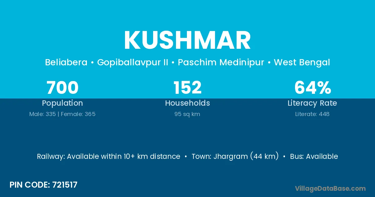 Jhargram (44 km) is the nearest town to Kushmar village for major economic activities and is located approximately 44 km away.