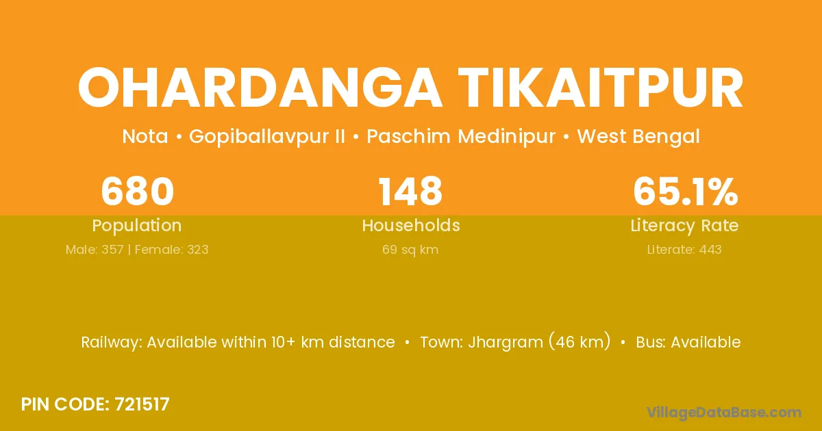 Jhargram (46 km) is the nearest town to Ohardanga Tikaitpur village for major economic activities and is located approximately 46 km away.