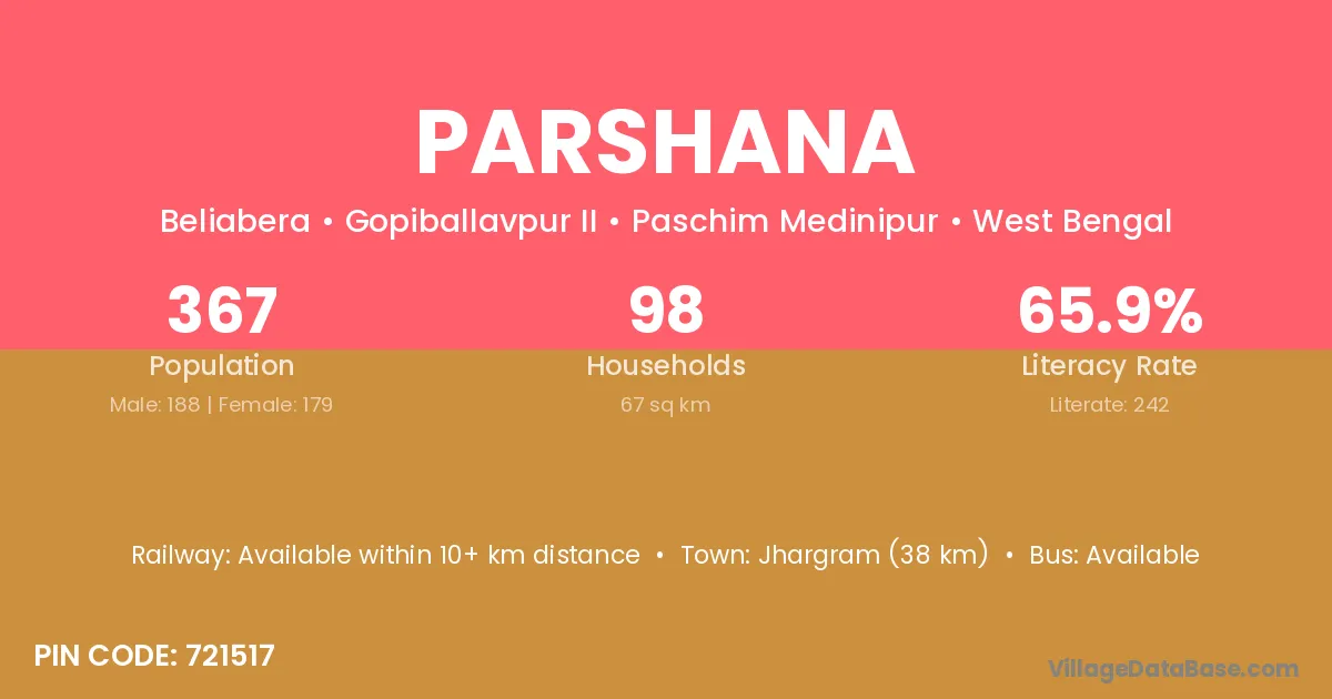 Jhargram (38 km) is the nearest town to Parshana village for major economic activities and is located approximately 38 km away.