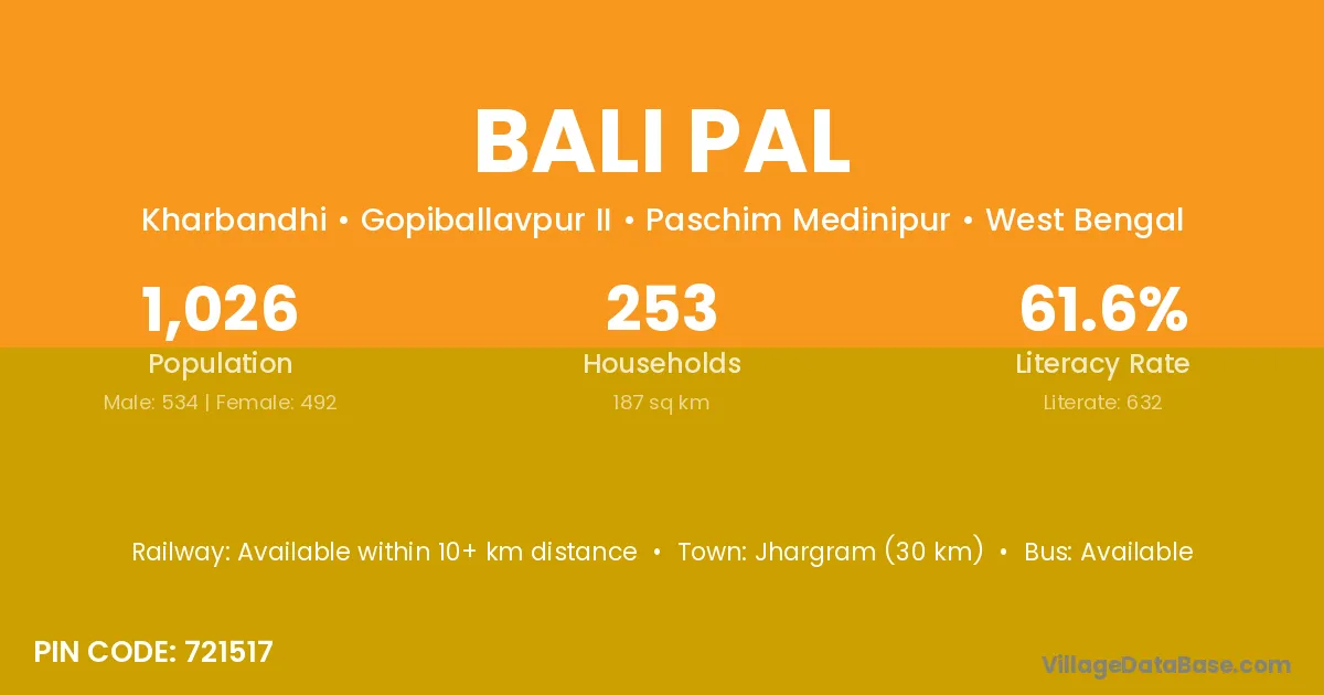 Jhargram (30 km) is the nearest town to Bali Pal village for major economic activities and is located approximately 30 km away.
