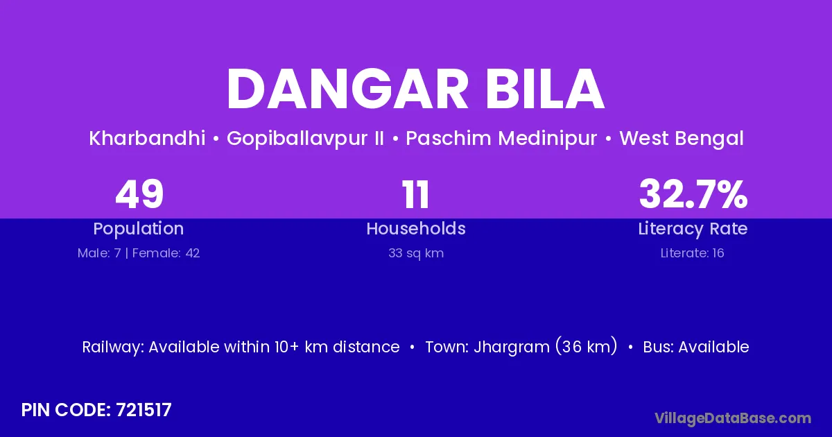 Jhargram (36 km) is the nearest town to Dangar Bila village for major economic activities and is located approximately 36 km away.