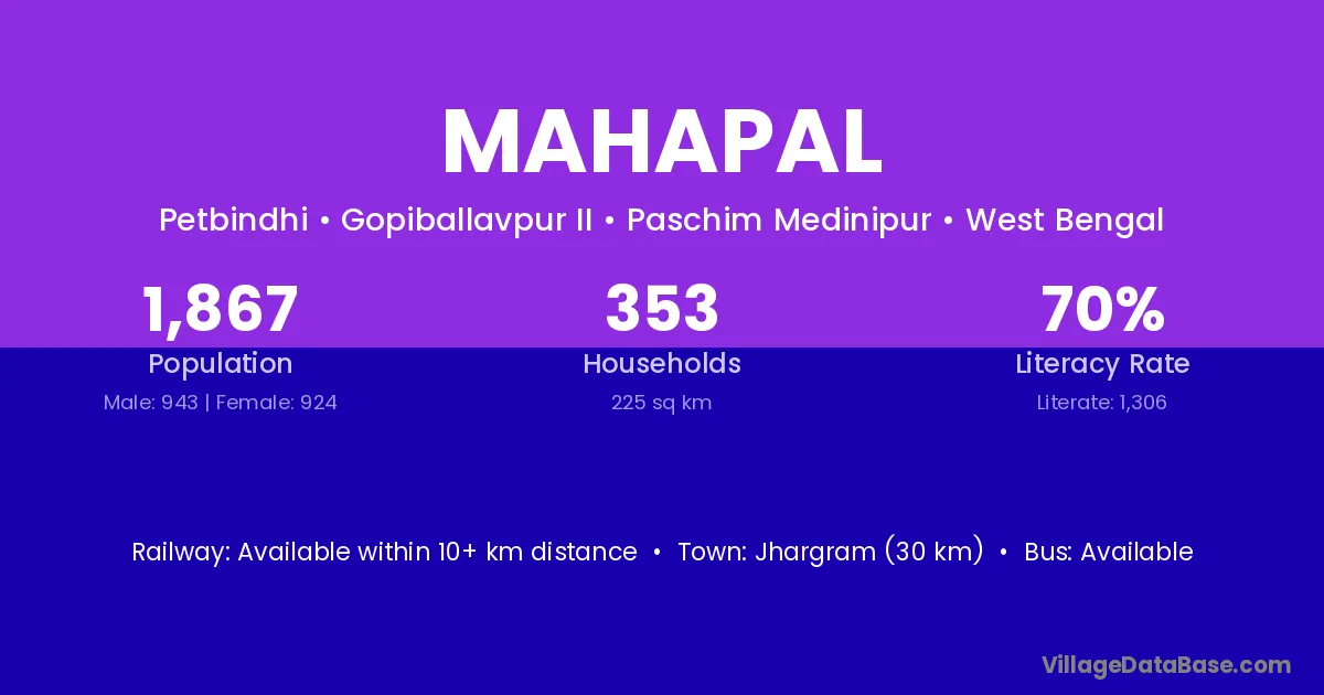 Jhargram (30 km) is the nearest town to Mahapal village for major economic activities and is located approximately 30 km away.