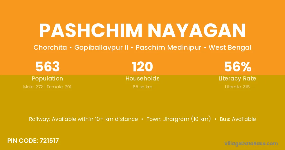 Pashchim Nayagan village has a total population of 563 people, of which 272 are males and 291 are females.