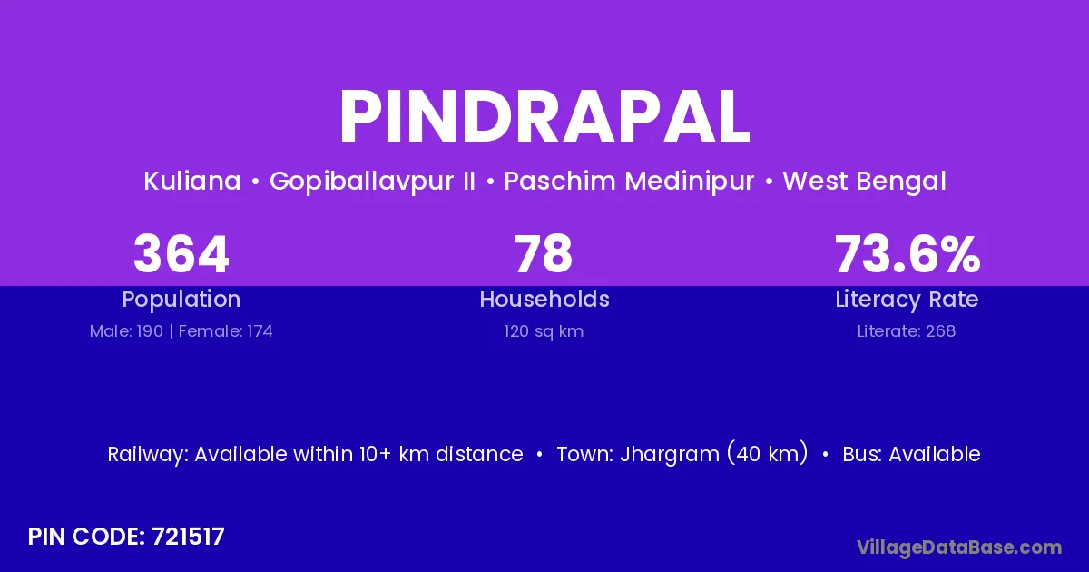 Jhargram (40 km) is the nearest town to Pindrapal village for major economic activities and is located approximately 40 km away.