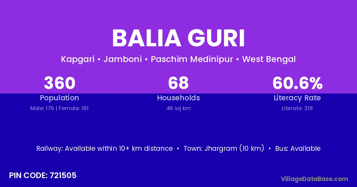 Jhargram (10 km) is the nearest town to Balia Guri village for major economic activities and is located approximately 10 km away.