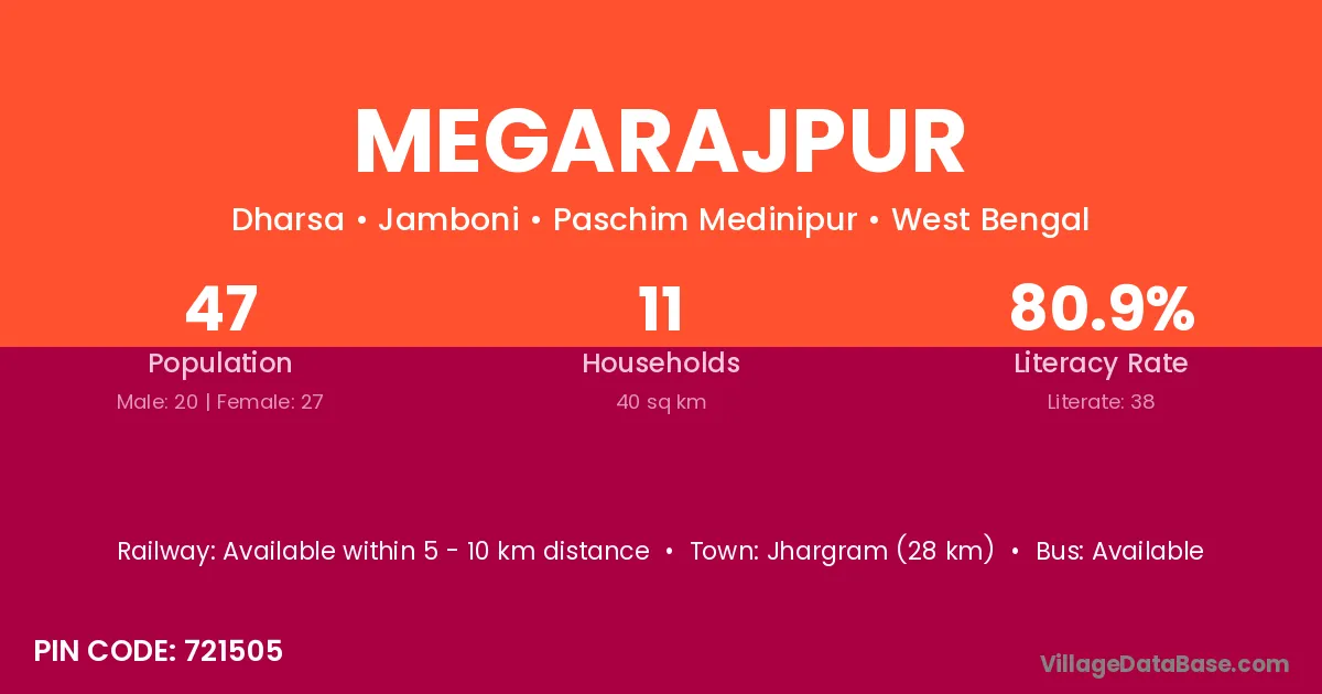 Jhargram (28 km) is the nearest town to Megarajpur village for major economic activities and is located approximately 28 km away.