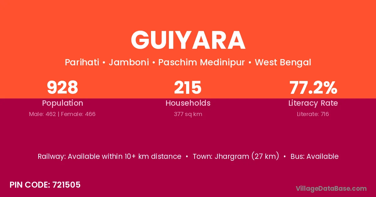 Jhargram (27 km) is the nearest town to Guiyara village for major economic activities and is located approximately 27 km away.