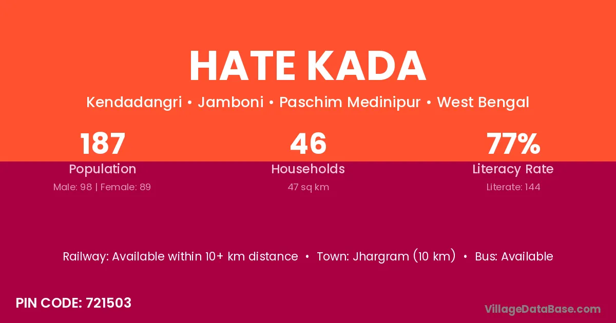 Jhargram (10 km) is the nearest town to Hate Kada village for major economic activities and is located approximately 10 km away.