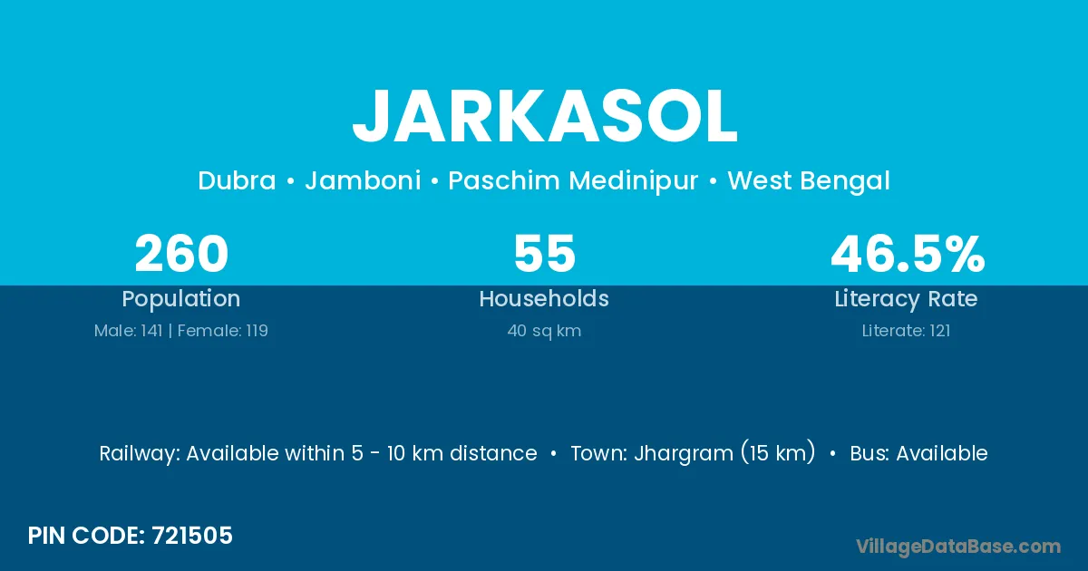 Jhargram (15 km) is the nearest town to Jarkasol village for major economic activities and is located approximately 15 km away.