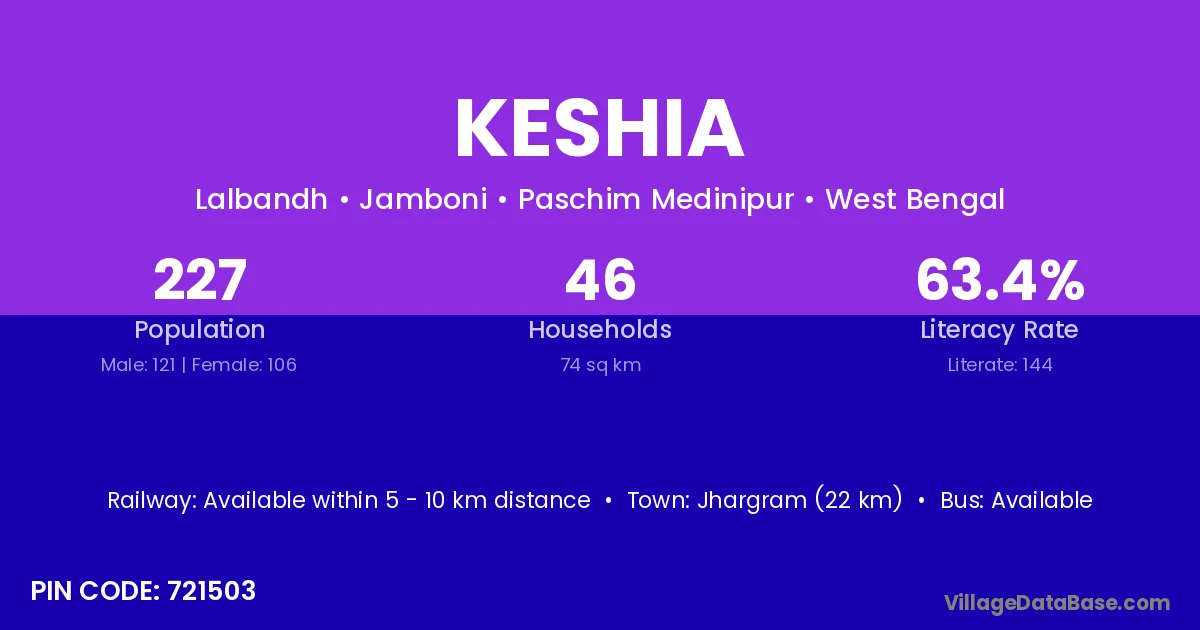 Jhargram (22 km) is the nearest town to Keshia village for major economic activities and is located approximately 22 km away.