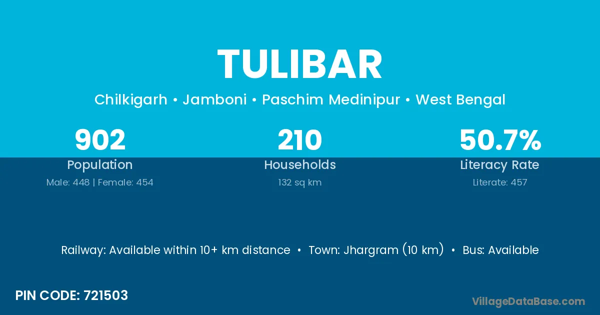 Jhargram (10 km) is the nearest town to Tulibar village for major economic activities and is located approximately 10 km away.