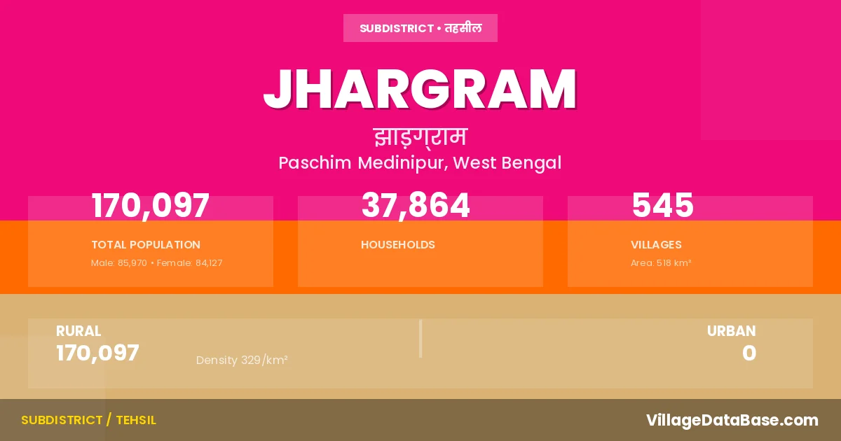 According to the 2011 census The total area of Jhargram Subdivision is 518 km², with a population of 170097 people. The population density is 329 inhabitants per square kilometre, and there are approximately 37864 houses in the sub district.