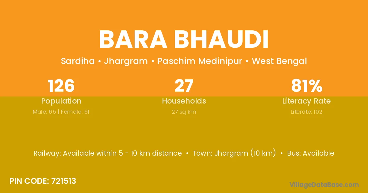 Jhargram (10 km) is the nearest town to Bara Bhaudi village for major economic activities and is located approximately 10 km away.