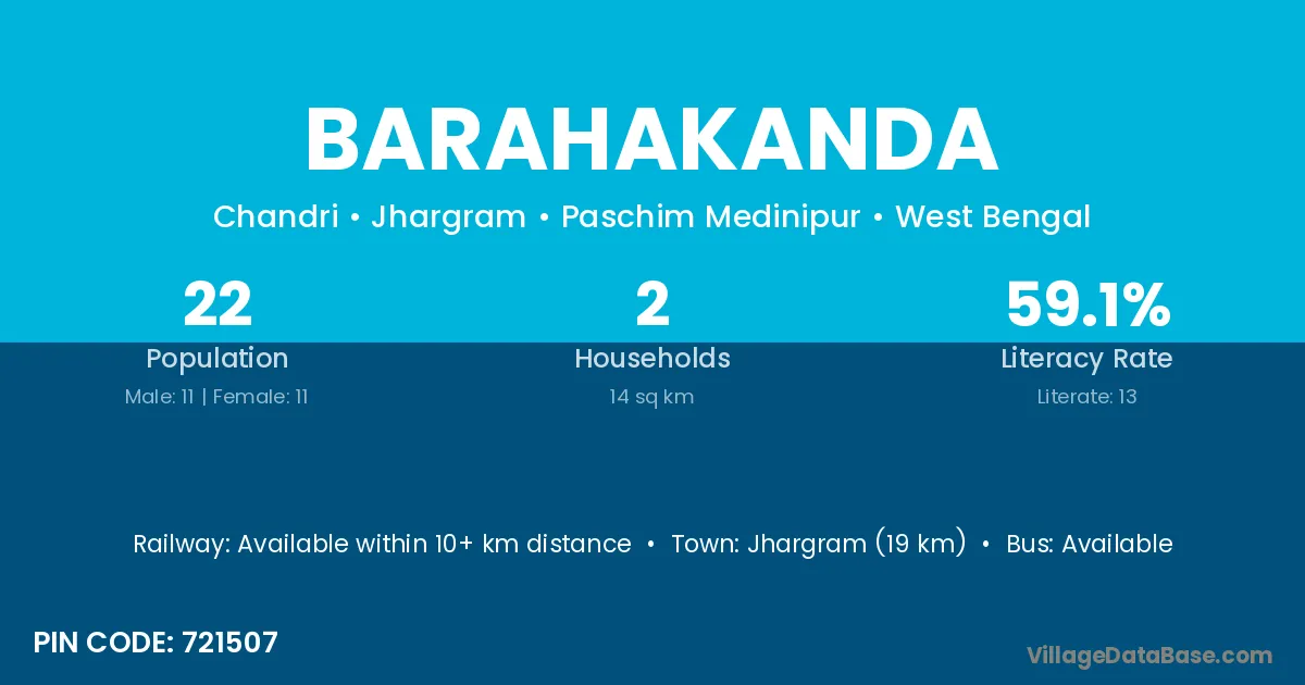 Jhargram (19 km) is the nearest town to Barahakanda village for major economic activities and is located approximately 19 km away.