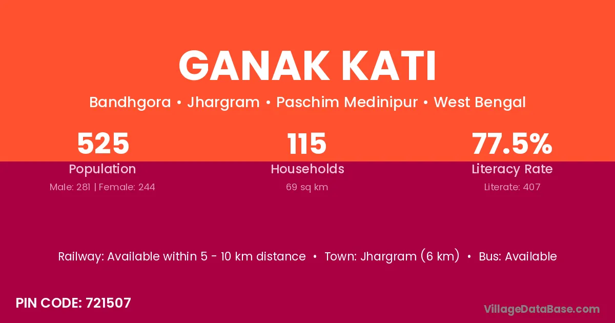 Jhargram (6 km) is the nearest town to Ganak Kati village for major economic activities and is located approximately 6 km away.