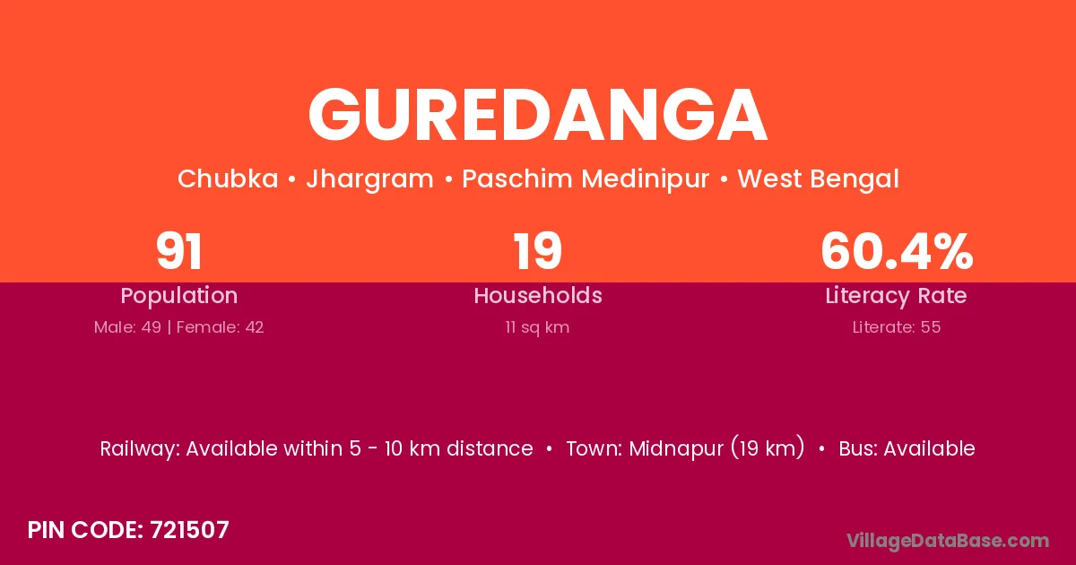 Midnapur (19 km) is the nearest town to Guredanga village for major economic activities and is located approximately 19 km away.