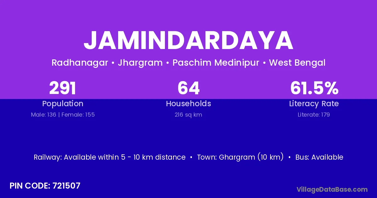 Ghargram (10 km) is the nearest town to Jamindardaya village for major economic activities and is located approximately 10 km away.