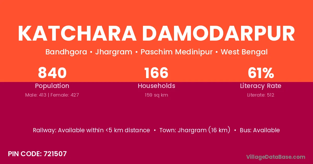 Jhargram (16 km) is the nearest town to Katchara Damodarpur village for major economic activities and is located approximately 16 km away.