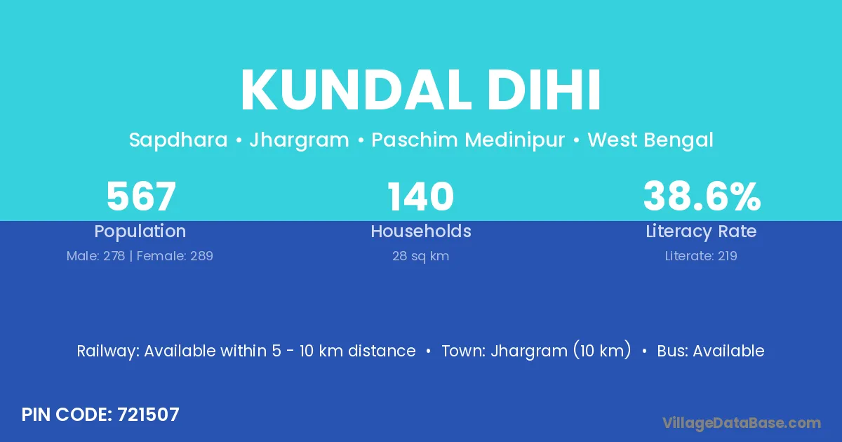 Jhargram (10 km) is the nearest town to Kundal Dihi village for major economic activities and is located approximately 10 km away.