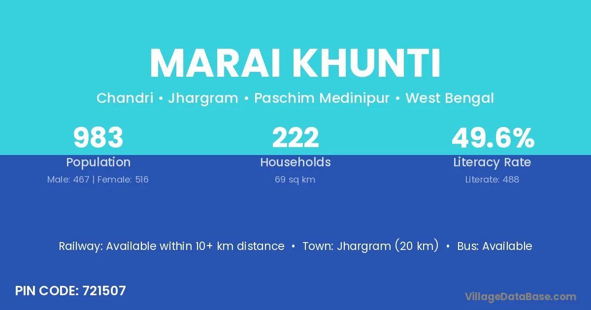 Jhargram (20 km) is the nearest town to Marai Khunti village for major economic activities and is located approximately 20 km away.
