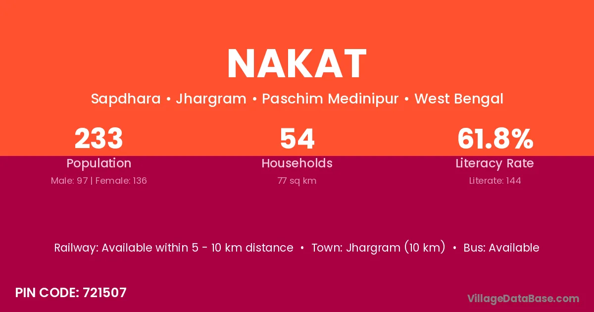 Jhargram (10 km) is the nearest town to Nakat village for major economic activities and is located approximately 10 km away.
