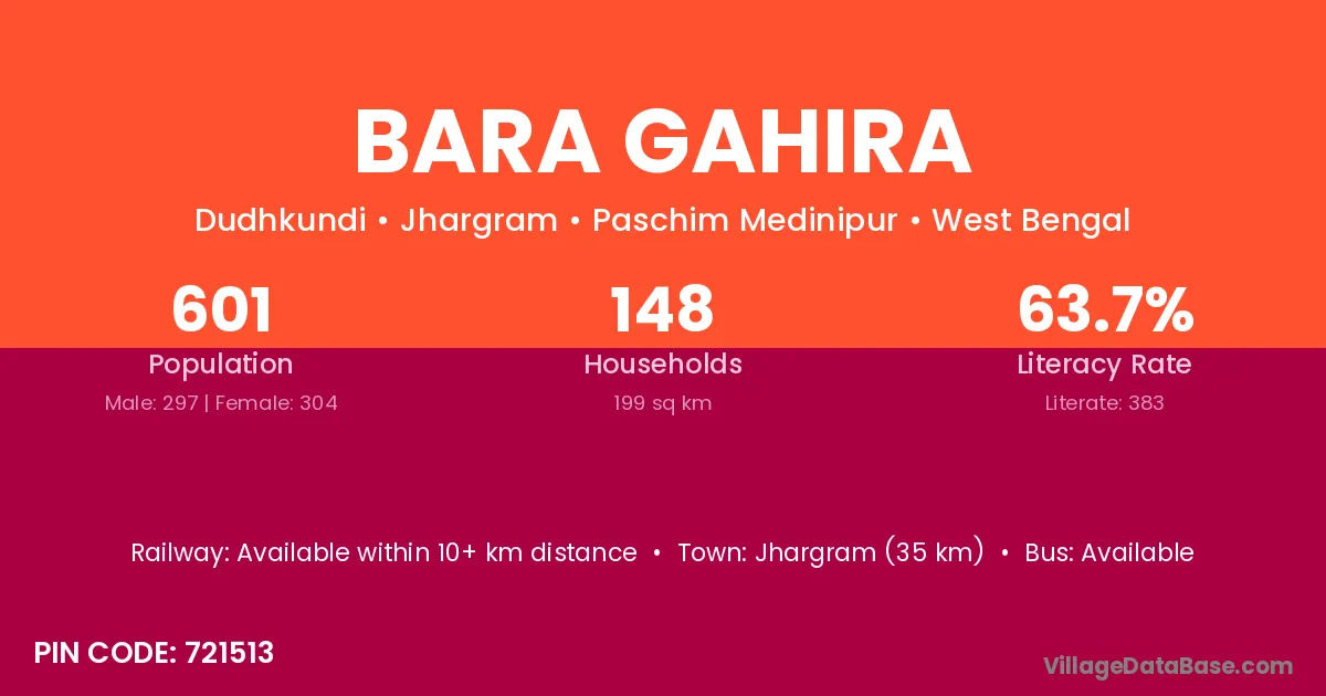 Jhargram (35 km) is the nearest town to Bara Gahira village for major economic activities and is located approximately 35 km away.