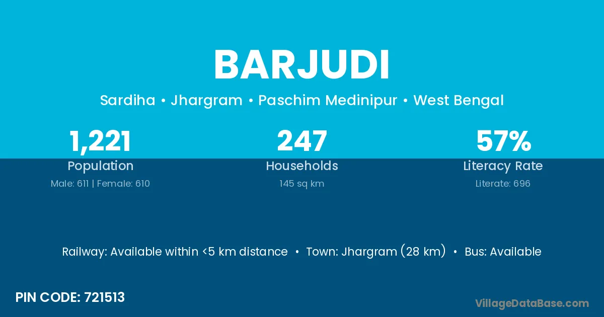 Jhargram (28 km) is the nearest town to Barjudi village for major economic activities and is located approximately 28 km away.
