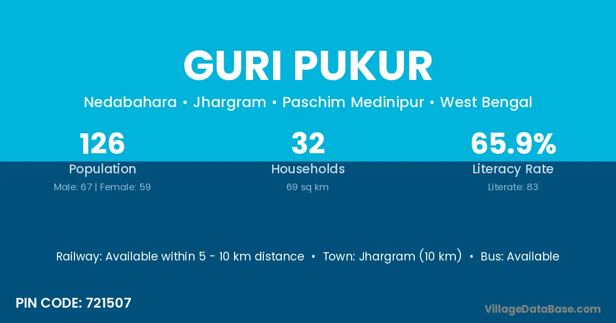 Jhargram (10 km) is the nearest town to Guri Pukur village for major economic activities and is located approximately 10 km away.
