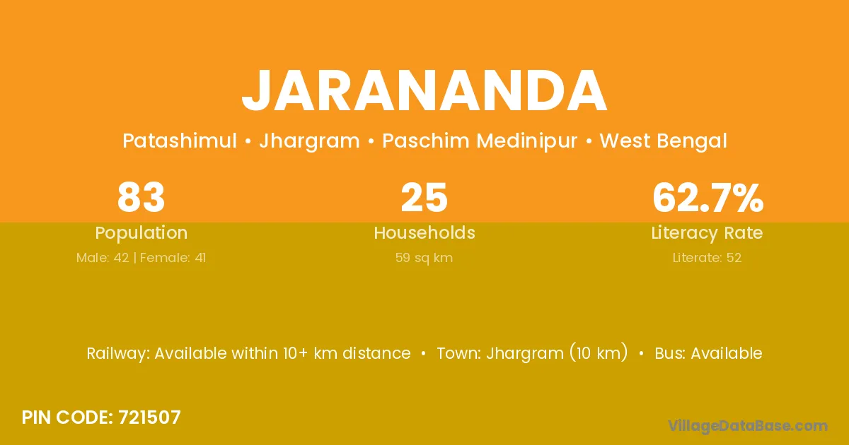 Jhargram (10 km) is the nearest town to Jarananda village for major economic activities and is located approximately 10 km away.