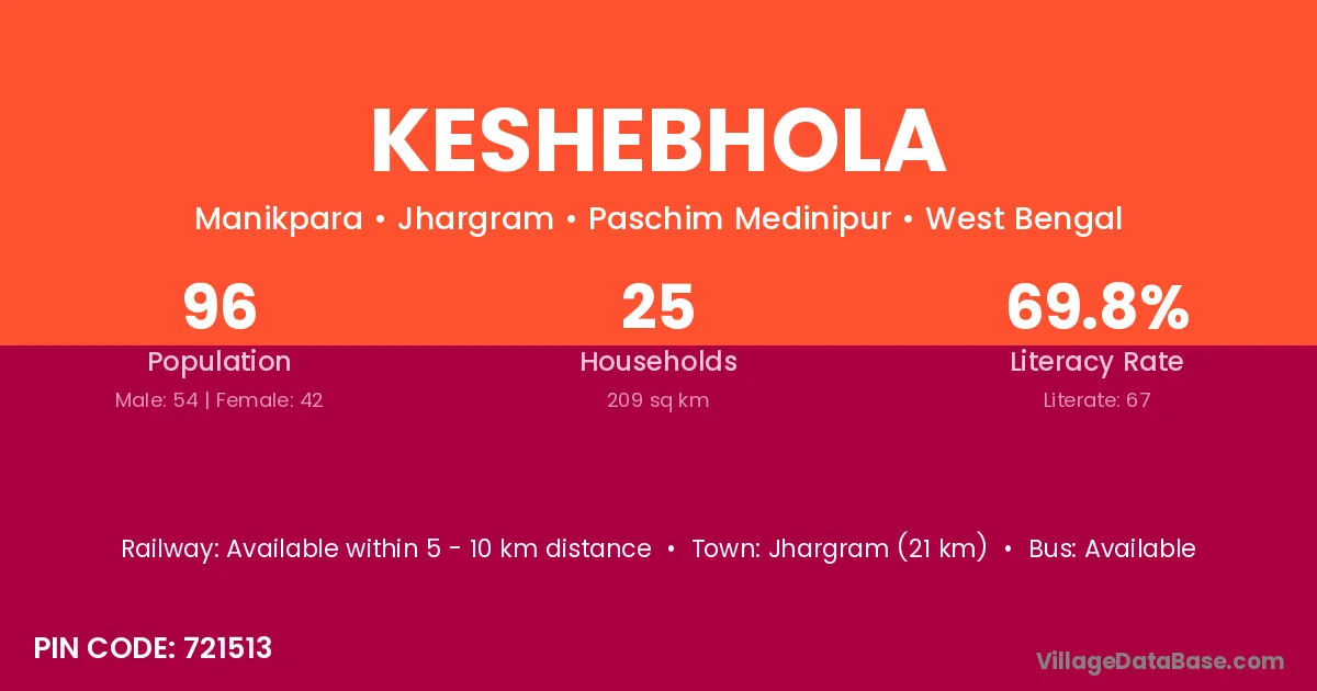 Jhargram (21 km) is the nearest town to Keshebhola village for major economic activities and is located approximately 21 km away.