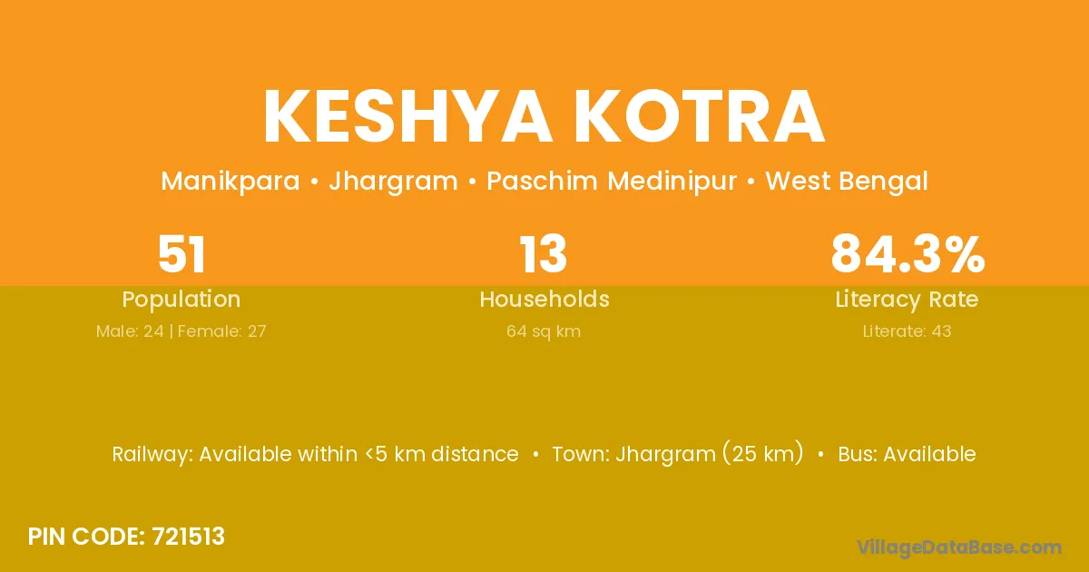 Jhargram (25 km) is the nearest town to Keshya Kotra village for major economic activities and is located approximately 25 km away.