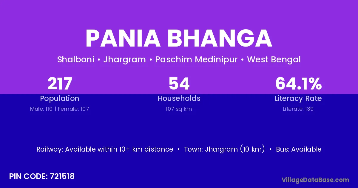 Jhargram (10 km) is the nearest town to Pania Bhanga village for major economic activities and is located approximately 10 km away.