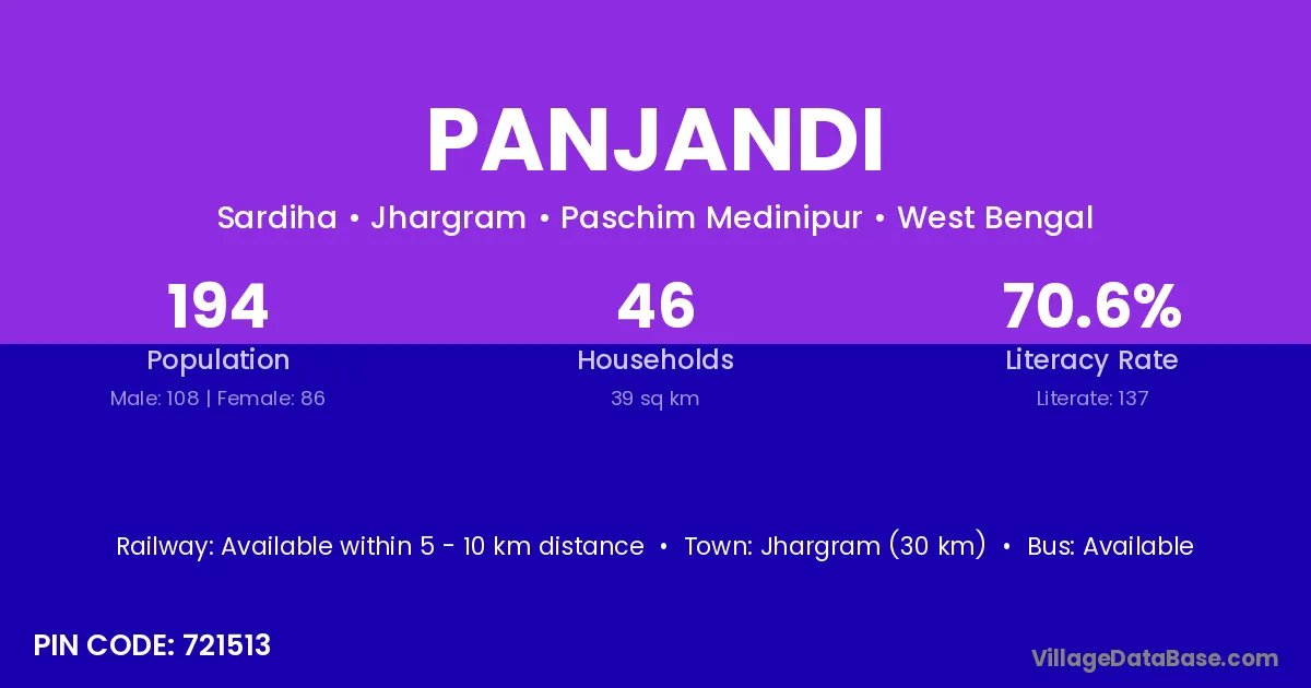 Jhargram (30 km) is the nearest town to Panjandi village for major economic activities and is located approximately 30 km away.
