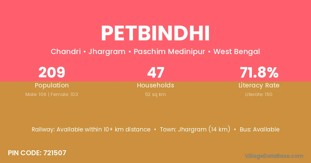 Jhargram (14 km) is the nearest town to Petbindhi village for major economic activities and is located approximately 14 km away.