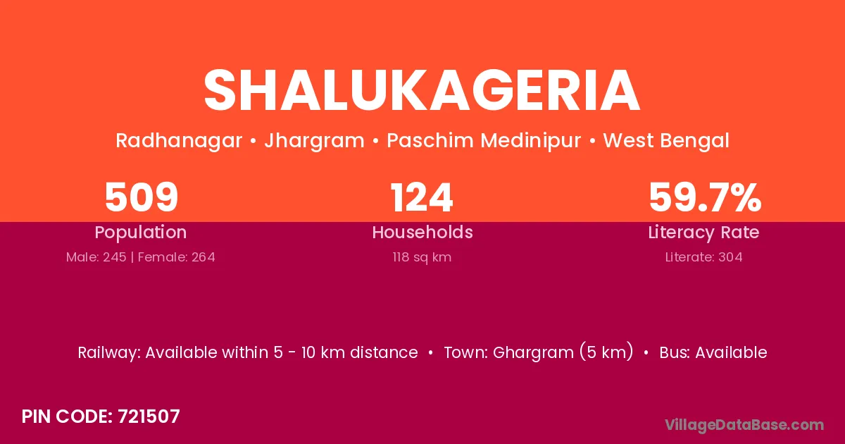 Shalukageria village has a total population of 509 people, of which 245 are males and 264 are females.