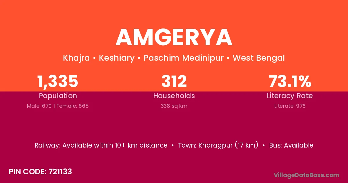 Kharagpur (17 km) is the nearest town to Amgerya village for major economic activities and is located approximately 17 km away.