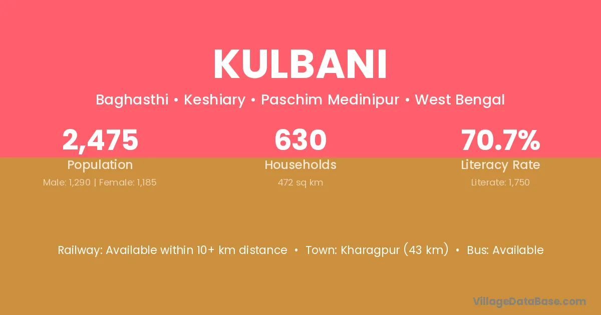Kharagpur (43 km) is the nearest town to Kulbani village for major economic activities and is located approximately 43 km away.
