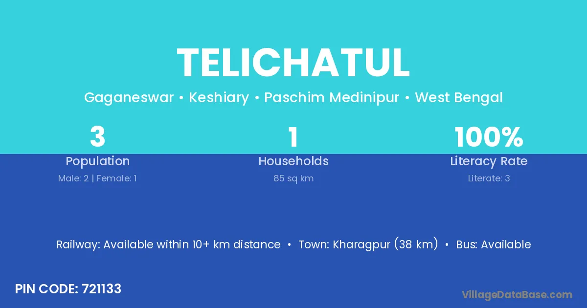 Telichatul village is located in the Keshiary Subdivision of the Paschim Medinipur district in West Bengal.