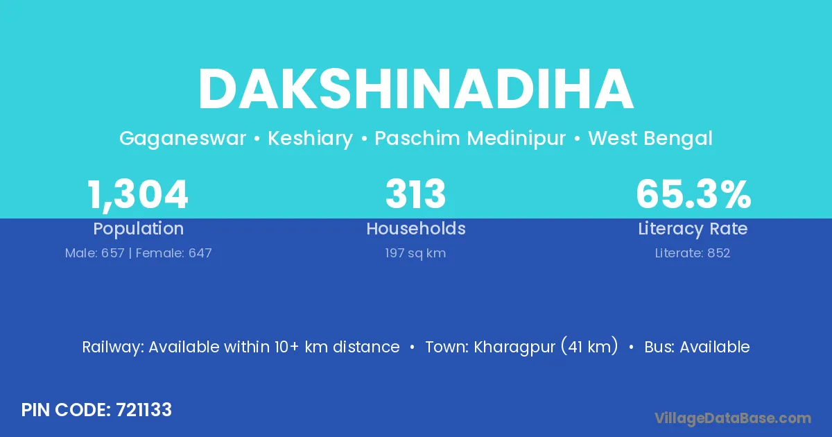 Dakshinadiha village has a total population of 1,304 people, of which 657 are males and 647 are females.